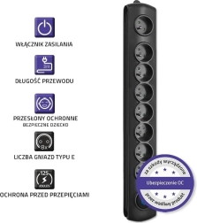 Bezpieczeństwo jest na pierwszym miejscu: zintegrowany warystor chroni przed nagłymi skokami napięcia, zabezpieczenia przed dziećmi utrudniają niepożądany kontakt, a niepalny materiał PP zwiększa odporność podczas codziennego użytkowania. Przemyślany czarny design świetnie pasuje do nowoczesnych wnętrz, umożliwia nawinięcie nadmiaru przewodu wokół korpusu listwy i oferuje także możliwość montażu do mebli.