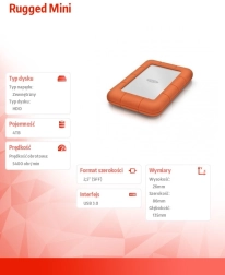 LaCie Rugged Mini 4TB to idealny wybór dla użytkowników poszukujących solidnego zewnętrznego dysku twardego z wystarczającą pojemnością i szybkim transferem danych. Dysk został zaprojektowany tak, aby wytrzymać upadek z wysokości do 1,2 metra, nacisk do jednej tony oraz jest odporny na deszcz i kurz. Idealny do użytku w terenie.