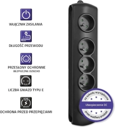 Obsługa jest maksymalnie wygodna dzięki podświetlanemu nożnemu przełącznikowi Quick Switch – jednym naciśnięciem wyłączysz lub włączysz zasilanie wszystkich podłączonych urządzeń. Bezpieczeństwo zapewniają elementy przeciwprzepięciowe (warystor), zabezpieczenia dziecięce we wszystkich gniazdach oraz niepalne wykonanie z PP.