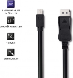 Połącz laptop lub PC z monitorem, telewizorem albo projektorem za pomocą wysokiej jakości kabla Mini DisplayPort–DisplayPort 1.1 o długości 1,8 m. Oferuje Full HD 1080p, nawet 4K przy 30 Hz, 144 Hz przy 1080p, 8‑kanałowy dźwięk oraz ochronę treści DPCP dla bezpiecznego i płynnego przesyłu obrazu i audio.