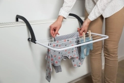Suszarka na grzejnik z wytrzymałymi ramionami, którą można zawiesić także na balkonie. Idealna do małego, codziennego prania. Posiada regulowane i składane ramiona z plastiku, wyposażone w osłony chroniące powierzchnie przed zarysowaniem podczas użytkowania.