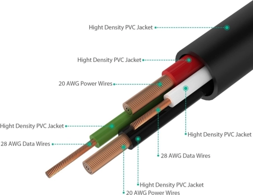 Gęsty płaszcz z wielowarstwowym ekranowaniem oraz grubsze przewody zasilające zapewniają trwałość i stabilny transfer danych oraz energii.