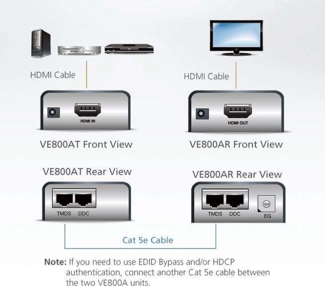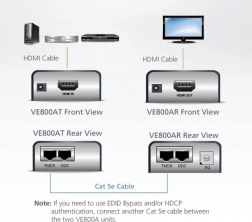 VE800A Przedłużacz HDMI wydłuża zasięg monitora HDMI do 60 m z urządzenia ręcznego HDMI za pomocą pojedynczego kabla Cat 5e. VE800A firmy ATEN wykorzystuje nową technologię, która umożliwia przesył sygnałów A/V po jednym kablu Cat 5e. Dostępny jest port DDC, który umożliwia użycie EDID monitora poprzez podłączenie dodatkowego kabla Cat 5e. Model VE800A obsługuje funkcje HDMI, takie jak 3D i Deep Color, zapewniając doskonałą jakość obrazu, której oczekujesz.