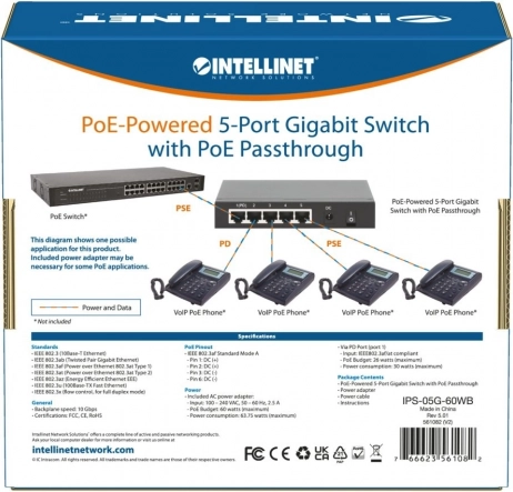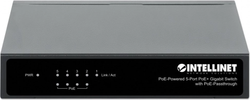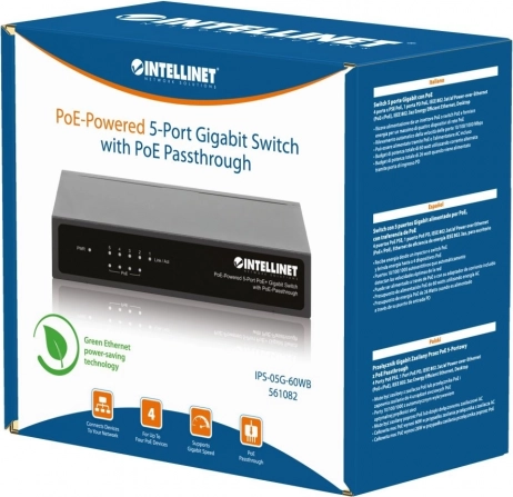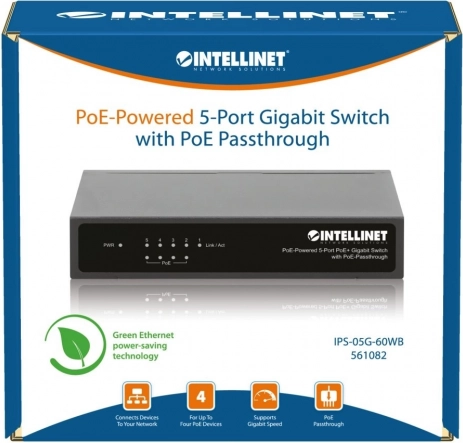 Rozbuduj sieć łatwo i bez dodatkowego okablowania. Ten 5‑portowy gigabitowy przełącznik INTELLINET z PoE passthrough potrafi zasilać do 4 urządzeń końcowych, takich jak bezprzewodowe punkty dostępowe, telefony VoIP czy kamery IP. Dzięki możliwości zasilania przez wejście PoE lub z dołączonego zasilacza AC zyskujesz maksymalną elastyczność w każdej instalacji.
