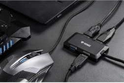 Hub USB rozszerza twój komputer o 4 dodatkowe porty USB do podłączenia urządzeń peryferyjnych, takich jak mysz, klawiatura czy zewnętrzne dyski twarde. Oferuje maksymalny prąd ładowania 2,4 A na jeden port przy użyciu zewnętrznego źródła zasilania (nie jest częścią zestawu).