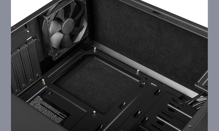 Wnętrze zaprojektowano z myślą o i elastyczności: wsparcie chłodzenia nawet pięcioma wentylatorami (2× przód, 2× góra, 1× tył – 2× 120 mm zainstalowane fabrycznie), kompatybilność z chłodzeniem wodnym oraz przemyślana osłona tunelowa dla zasilacza i dysków 3,5". Łatwo demontowalne filtry przeciwkurzowe (górny magnetyczny, dolny przy PSU oraz przedni) utrzymują czystość i stabilne temperatury.