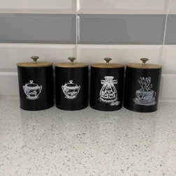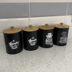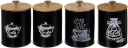 Zestaw zawiera cztery pojemniki oznaczone jako 'Sól', 'Cukier', 'Herbata' i 'Kawa', co pomaga utrzymać ich zawartość zorganizowaną i łatwo dostępną. Dzięki metalowemu uchwytowi na pokrywce, otwieranie i zamykanie pojemników jest proste i wygodne.