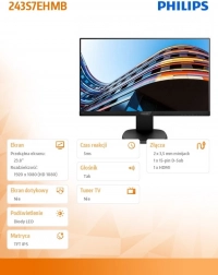 Monitor Philips o przekątnej 23,8 cala oferuje ostry obraz dzięki technologii IPS. Zapewnia elastyczne opcje podłączenia przez HDMI i posiada funkcję pivot do wygodnego obracania ekranu. Odpowiedni także do multimediów dzięki wbudowanym głośnikom.