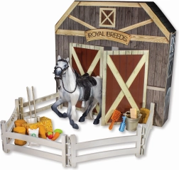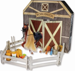 Ten zestaw zawiera Koń Royal Breeds o rozmiarze 17 cm z interaktywnymi elementami, które zainteresują każde dziecko. Otwierana tylna część opakowania rozszerza możliwości zabawy i przekształca się w stajnie:
