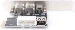 Dwie zewnętrzne gniazda umożliwiają natychmiastowe podłączanie peryferiów, natomiast wewnętrzne złącze sprawdzi się do wyprowadzenia na przedni panel lub dla wewnętrznych urządzeń FireWire. Zintegrowane 4‑pinowe zasilanie dostarcza portom dodatkowej mocy dla bardziej wymagających peryferiów.