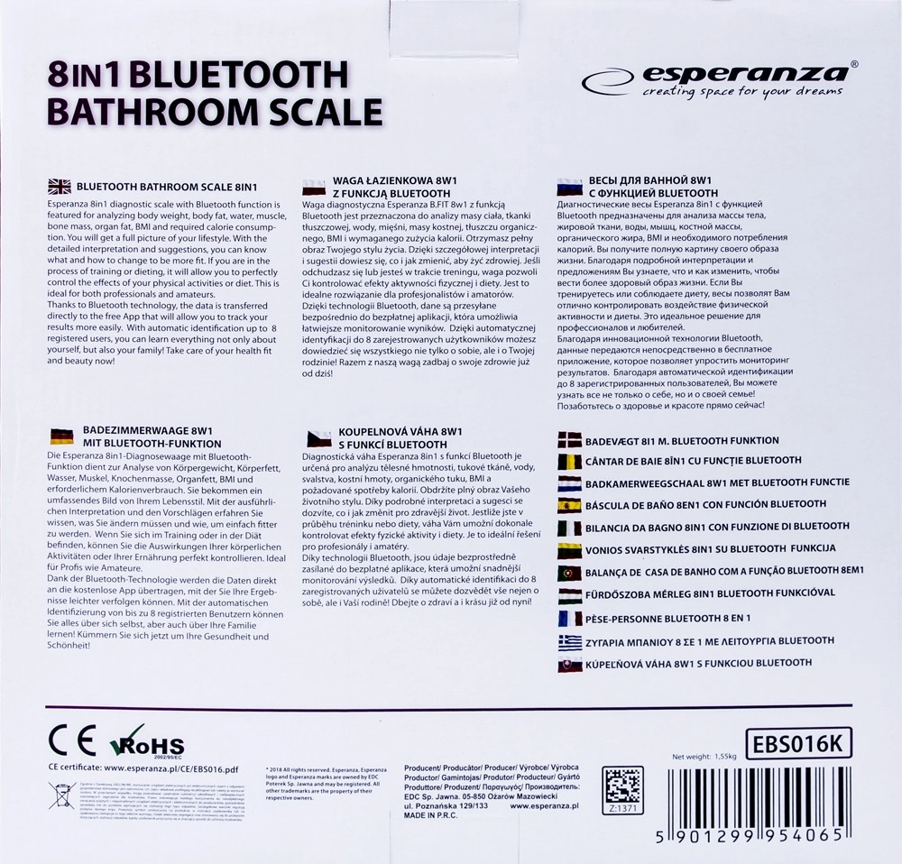 Odkryj innowacyjną wagę osobistą Esperanza „8w1” B.FIT, która wykorzystuje technologię BIA (bioimpedancja elektryczna) do precyzyjnej analizy składu ciała. Szybkie i łatwe pomiary dostarczają wszystkich ważnych informacji do monitorowania stanu zdrowia.