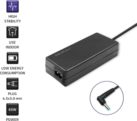 Niezawodny zasilacz Qoltec do laptopów HP o mocy 65 W i napięciu 19,5 V zapewnia stabilne, bezpieczne i energooszczędne zasilanie w domu i biurze. Smukła konstrukcja Slim z wtykiem 4,5 × 3,0 mm + pin idealnie sprawdzi się jako ładowarka główna i zapasowa, a urządzenie jest chronione dzięki zaawansowanym zabezpieczeniom przed przepięciem, przeciążeniem, zwarciem i przegrzaniem.
