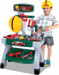 Dziecięcy stolik warsztatowy z bogatym zestawem narzędzi dla małych majsterkowiczów oferuje wszystko, co potrzebne do kreatywnej zabawy i rozwoju motoryki. Zawiera kask, śruby, nakrętki, koła zębate, szczypce, młotek, klucze, piłkę, kombinerki, śrubokręty oraz imadło. Kompaktowe wymiary 44 × 28 × 71 cm gwarantują łatwe ustawienie w pokoju dziecięcym.
