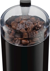 Przezroczysta pokrywka do kontroli mielenia oraz pojemność do 75 g ziaren dla kilku filiżanek jednocześnie.