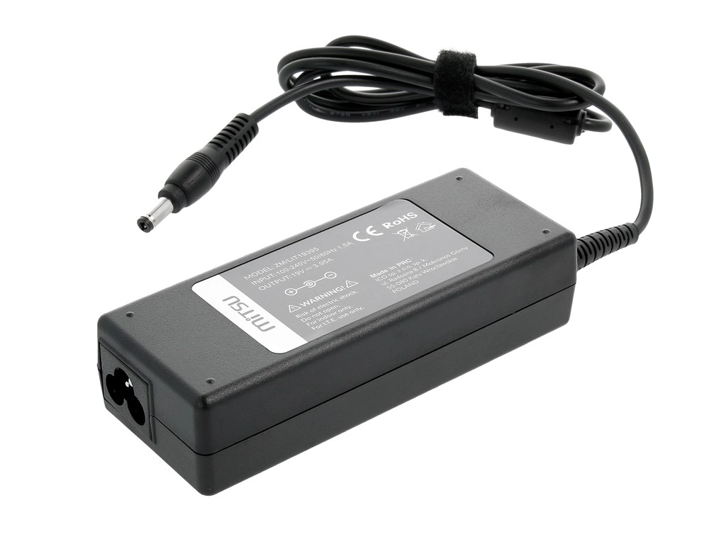 Niezawodny zasilacz Mitsu o mocy 75 W z wyjściem 19 V / 3,95 A i wtykiem 5,5 × 2,5 mm to idealny zamiennik do laptopów Toshiba, Compaq, HP i ASUS. Oferuje filtr ferrytowy oraz zaawansowane zabezpieczenia przed przepięciem, przegrzaniem, przeciążeniem i zwarciem, a także spełnia rygorystyczne certyfikaty CE, RoHS i FCC dla bezpiecznej i bezproblemowej pracy.