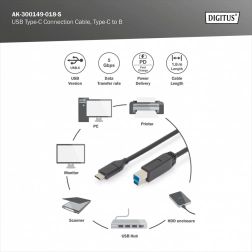 Ten wysokiej jakości kabel USB 3.0 z końcówkami USB‑C (męski) – USB‑B (męski) służy do łączenia urządzeń hosta (komputer, laptop, hub USB) z peryferiami wyposażonymi w port USB‑B, takimi jak obudowy dysków twardych, skanery czy drukarki. Dzięki standardowi USB 3.0 osiąga SuperSpeed transfer do 5 Gbit/s, co jest nawet 10× szybciej niż USB 2.0, umożliwiając szybkie kopie zapasowe i płynną pracę z dużymi plikami.