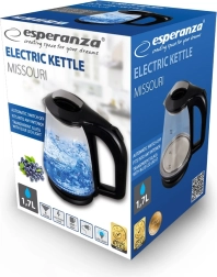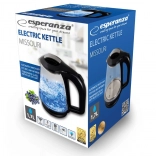 Szklany czajnik elektryczny ESPERANZA MISSOURI o pojemności 1,7 l oferuje elegancki czarny design, niebieskie podświetlenie LED, automatyczne wyłączanie oraz czytelną podziałkę poziomu. Dzięki żaroodpornemu szkłu i zintegrowanej płycie grzewczej codzienne podgrzewanie wody jest szybkie, bezpieczne i wygodne.