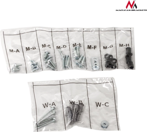W zestawie znajduje się przejrzyście posegregowany komplet śrub, kołków i elementów dystansowych do sprawnej i szybkiej instalacji na różnych typach ścian.
