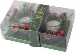 Eleganckie szklane świeczniki są otoczone sztucznymi elementami, które gwarantują trwałość i długotrwałe piękno. Doskonale pasują do każdego wnętrza, dzięki swojemu klasycznemu wyglądowi, który komponuje się z zimowym okresem.
