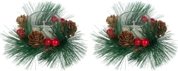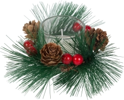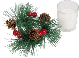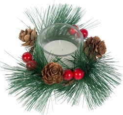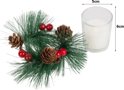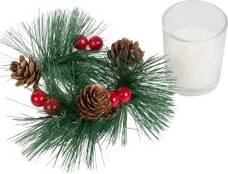 Te dekoracyjne świece w stylu bożonarodzeniowego wieńca są doskonałym dodatkiem na twój świąteczny stół lub półkę. Gałązki sosnowe, szyszki i czerwone jagody wokół szklanego świecznika dodają naturalnego bożonarodzeniowego uroku.