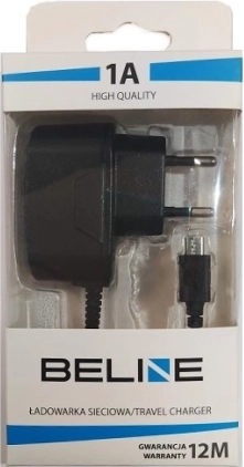 Ładowarka sieciowa BELINE z wbudowanym kablem micro USB, wyjście 1 A, czarna. Nowoczesny design i zabezpieczenia przed przepięciem oraz przeładowaniem dla bezpiecznego ładowania.