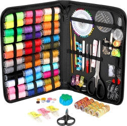 Kompletny zestaw do szycia w praktycznym etui zawiera wszystko, czego potrzebujesz do napraw odzieży i tworzenia. Znajdziesz tu 43 kolory i wzory nici, igły do różnych materiałów, 40 szpilek, centymetr krawiecki, ołówek do znakowania oraz 15 znaczników ściegu. Nie brakuje także prujki, różnych guzików, pęsety, nawlekaczy, naparstków, nożyczek, a nawet lupy do precyzyjnej pracy.