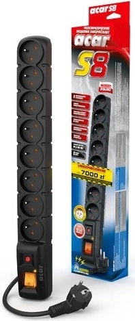 Wysokiej jakości czarna listwa zasilająca Acar S8 z 8 gniazdami, ochrona przeciwprzepięciowa i trzyletnia gwarancja.
