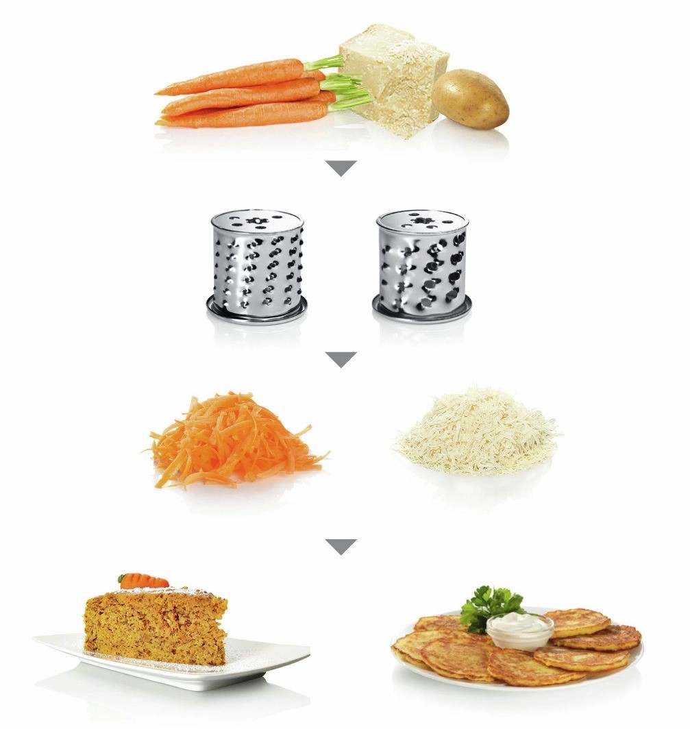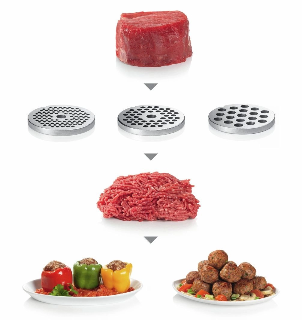 - Funkcje maszynki (ponad 10 funkcji) umożliwiają mielenie mięsa i ryb, a także tarcie warzyw, owoców, serów i innych produktów