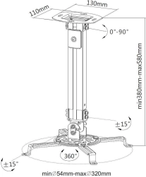 Uniwersalny sufitowy uchwyt do projektorów z regulowaną długością 38–58 cm w eleganckim, srebrnym wykończeniu. Bezpieczna konstrukcja stalowo‑aluminiowa, udźwig 13,5 kg oraz kompatybilne mocowanie z większością projektorów zapewniają niezawodną instalację w domu, biurze i przestrzeniach komercyjnych.