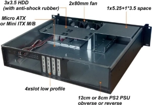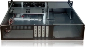 Kompaktowa obudowa PC rack 2U 19" dla Micro ATX/Mini ITX, z 1× 5,25", 4× 3,5", 2× USB z przodu i 2× 80 mm wentylatorami. Wsparcie zasilacza ATX.