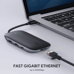 Maksymalizuj łączność swojego laptopa jednym podłączeniem. AUKEY 8w1 oferuje szybkie USB 3.0 do 5 Gb/s, płynny obraz przez HDMI 4K@30 Hz oraz stabilną sieć dzięki RJ45 10/100/1000 Mb/s. Jednocześnie zasila urządzenia przez USB‑C PD do 100 W, więc możesz pracować bez ograniczeń.