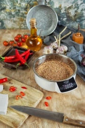 Praktyczna elektroniczna waga kuchenna o maksymalnym udźwigu 5 kg i dokładności 1 g do precyzyjnego pieczenia i zdrowego gotowania. Dzięki misce ze stali nierdzewnej łatwo się czyści, ma duży, czytelny wyświetlacz, funkcję tara, automatyczne i ręczne wyłączanie oraz potrafi mierzyć objętość wody i mleka.