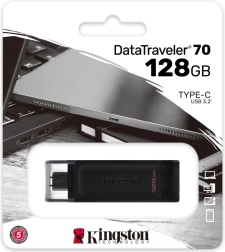 Lekki i przenośny pendrive USB‑C Kingston DataTraveler 70 o pojemności 128 GB z interfejsem USB 3.2 Gen 1. Idealny do laptopów, tabletów i telefonów z USB‑C. Oferuje szybki transfer danych, niezawodne tworzenie kopii zapasowych oraz 5‑letnią gwarancję z bezpłatnym wsparciem.