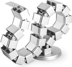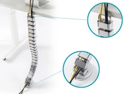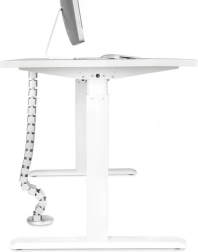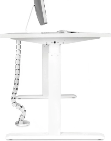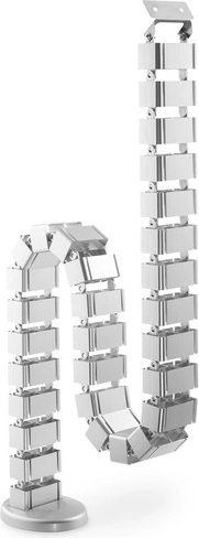 Ta elastyczna maskownica kabli w formie „kręgosłupa” elegancko ukrywa i porządkuje przewody od podłogi do blatu. Dzięki modułowej konstrukcji można łatwo skrócić lub wydłużyć jej długość w zależności od wysokości biurka, aż do 130 cm. Dociążona podstawa stabilnie trzyma spiralę na podłodze, a elastyczne segmenty płynnie składają się podczas opuszczania biurka z regulacją wysokości.