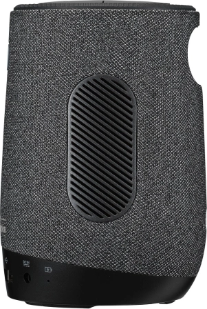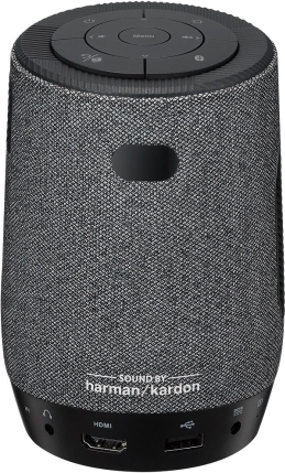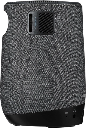 Tekstylny, walcowy kształt z górnym sterowaniem jest wygodny w przenoszeniu, a zintegrowany głośnik harman/kardon (w zależności od wersji) oferuje czysty i zaskakująco pełny dźwięk. Podłączanie jest proste — do dyspozycji masz HDMI dla źródeł obrazu, USB do zasilania lub nośników oraz Bluetooth dla bezprzewodowego dźwięku. Bezprzewodowe wyświetlanie z telefonu umożliwia szybkie udostępnianie treści.
