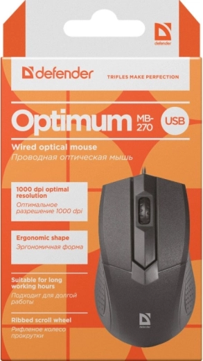 Przewodowa mysz optyczna DEFENDER Optimum MB-270 z rozdzielczością 1000 DPI i 3 przyciskami. Niezawodna, precyzyjna i wygodna do codziennej pracy.