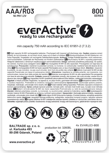 Akumulatory AAA (R03) o pojemności 800 mAh są wstępnie naładowane w technologii „ready to use”, dzięki czemu są gotowe do natychmiastowego użycia. Oferują wysoką niezawodność i stabilną wydajność w urządzeniach z częstym i wysokim poborem energii.