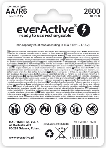 Te akumulatory AA (R6) o wysokiej pojemności 2600 mAh łączą długi czas pracy z odpornością na duży pobór prądu. W porównaniu ze zwykłymi bateriami alkalicznymi oferują podobną pojemność, ale z wyraźną zaletą wielokrotnego użycia, co oszczędza pieniądze i środowisko.