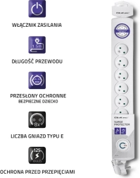 Listwa przeciwprzepięciowa jest wyposażona w różne elementy bezpieczeństwa, takie jak warystory chroniące przed wysokim napięciem, osłony zabezpieczające przed dostępem dzieci do gniazd oraz jest wykonana z niepalnego materiału PP dla Twojego bezpieczeństwa.