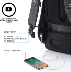 Ergonomiczne szelki, oddychające plecy, elementy odblaskowe oraz pas do mocowania na walizce. Zintegrowany port USB ułatwia ładowanie w drodze.