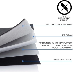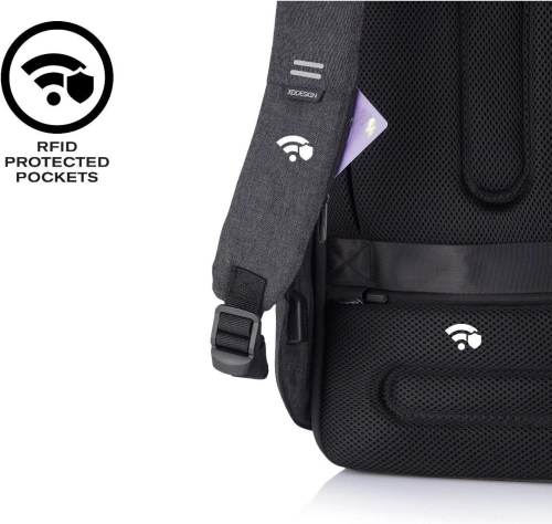 - Ukryte zamki, konstrukcja otwierana od strony pleców, kieszenie z ochroną RFID