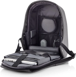 Plecak otwiera się wyłącznie od strony pleców, co utrudnia dostęp złodziejom. Ukryte kieszenie i zamki zapewniają dodatkową ochronę.
