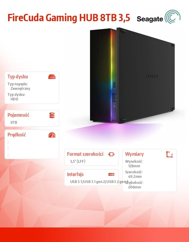 - Konfigurowalne podświetlenie RGB z pełną kontrolą kolorów i wzorów poprzez bezpłatne oprogramowanie Seagate.
