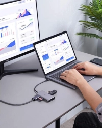 Hub Aukey CB-C91 USB-C to właściwie rozdzielacz 8 w 1. Wystarczy podłączyć go do jednego portu USB, aby zyskać aż OSIEM wejść niezbędnych do codziennej pracy. Wyposażono go w trzy porty USB 3.0, USB-C Power Delivery, port HDMI, port Ethernet, a także dwa gniazda na karty. Już nie zabraknie Ci wolnych portów USB — od teraz podłączysz wszystkie potrzebne urządzenia i jeszcze więcej.