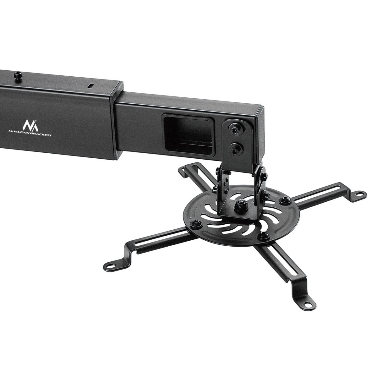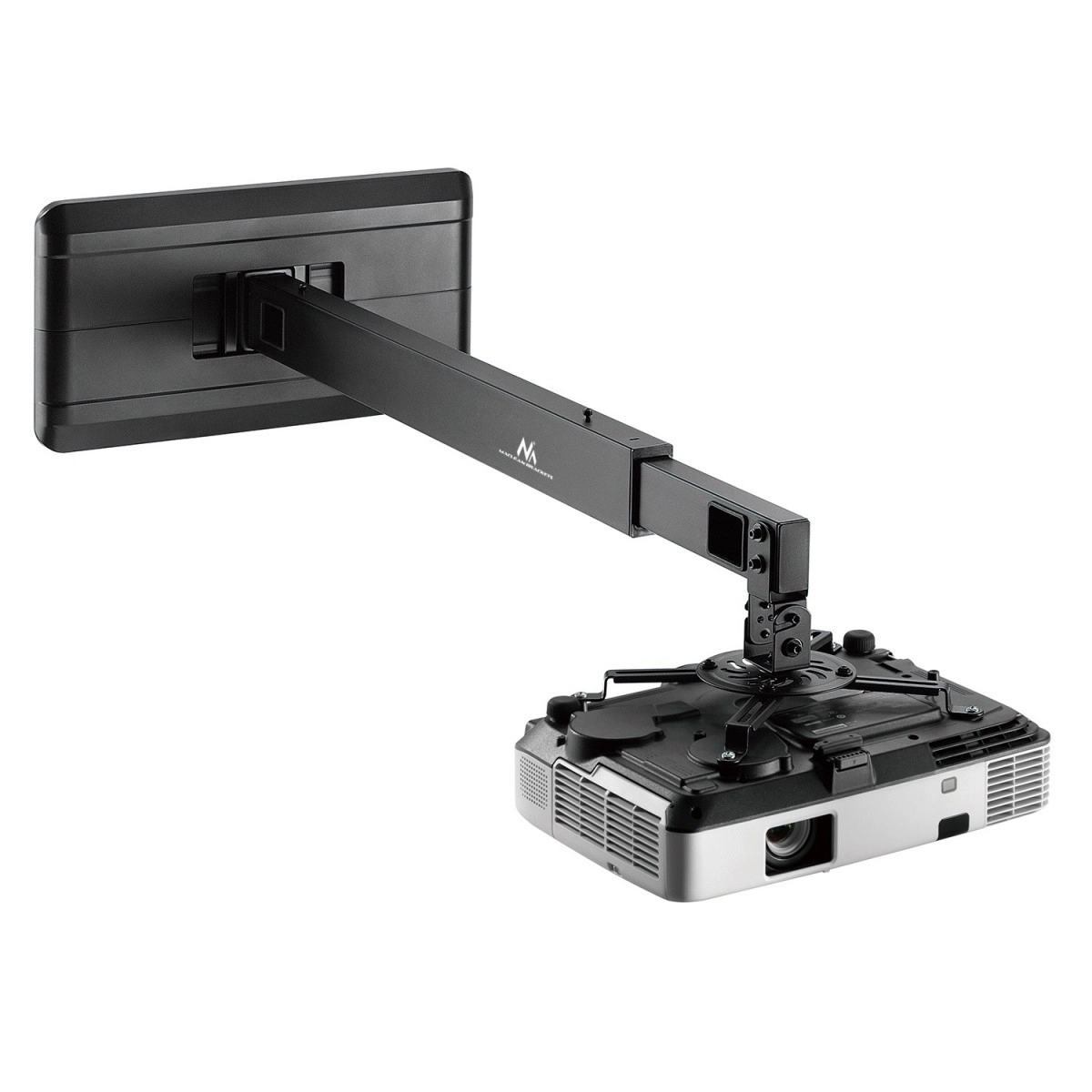 Uchwyt jest kompatybilny ze wszystkimi popularnymi projektorami dzięki regulowanemu rozstawowi otworów i umożliwia regulację odległości od ściany.