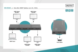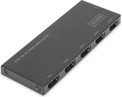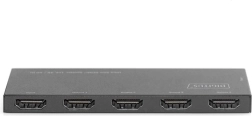Kompaktowy rozdzielacz HDMI DIGITUS dzieli jedno źródło HDMI na maksymalnie cztery wyświetlacze w rozdzielczości 4K/60 Hz. Oferuje pełną przepustowość 18 Gbps, obsługę HDR, 3D i HDCP 2.2, zasilanie przez Micro USB oraz wytrzymałą, ultracienką metalową obudowę. Idealny do TV, projektorów i digital signage w trybie 1×4.