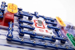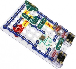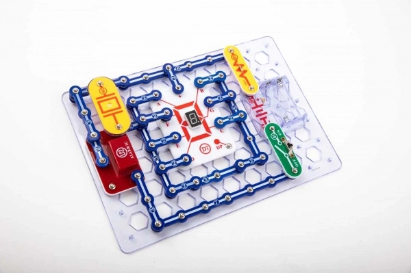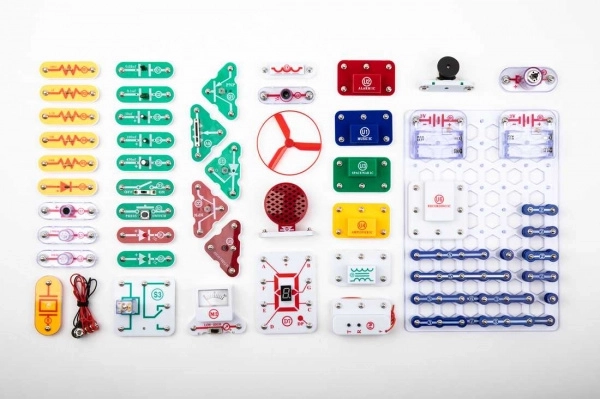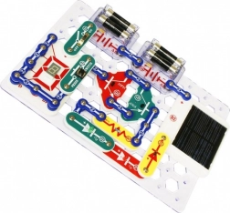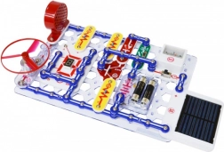 Elementy mocuje się do płyty bazowej za pomocą styków snap. Kolorowe oznaczenia i opisy komponentów ułatwiają orientację nawet dzieciom od 8. roku życia.