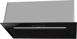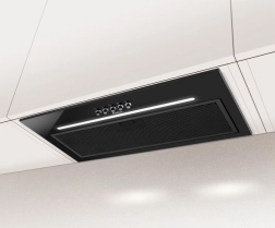 Wbudowany okap w czarnym kolorze doskonale uzupełnia nowoczesne wnętrza kuchni. Jego stonowany wygląd łatwo dopasować do górnych szafek.