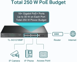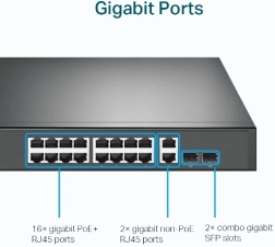 Ten switch oferuje 16 gigabitowych portów z obsługą PoE+, 2 gigabitowe porty RJ45 oraz 2 gigabitowe porty combo SFP dla maksymalnej elastyczności połączeń.