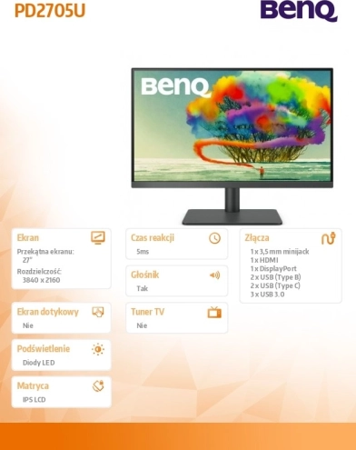 27" monitor BENQ PD2705U IPS 4K, 5 ms, HDMI/DP/USB‑C